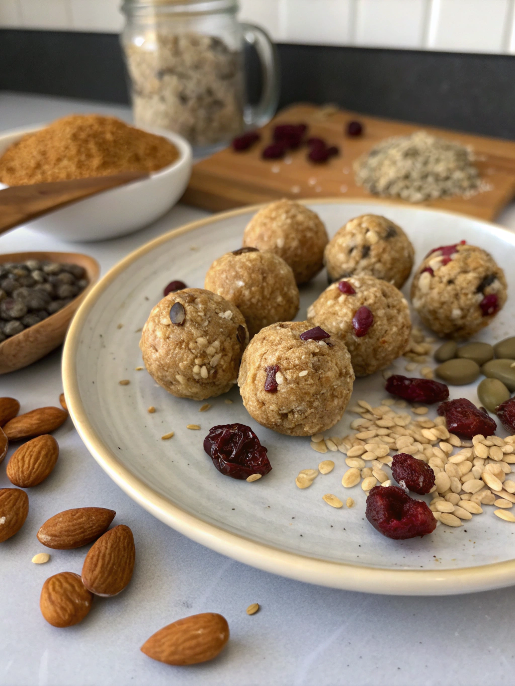 On-the-Go Breakfast: Pack 3-4 balls with a piece of fruit and Greek yogurt for a balanced, portable breakfast containing protein, healthy fats, and complex carbohydrates.